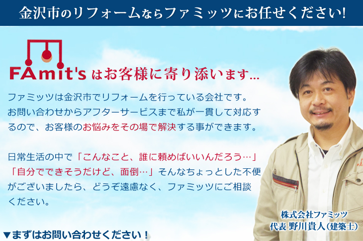 すでにある空間をただ分けるだけではなく、ご家族皆様が満足できる空間にリフォームすることが大事になってきますので、ご不明な点や小さなお悩みも、まずは建築士の資格を持った私にお気軽にお問合せくださいませ。